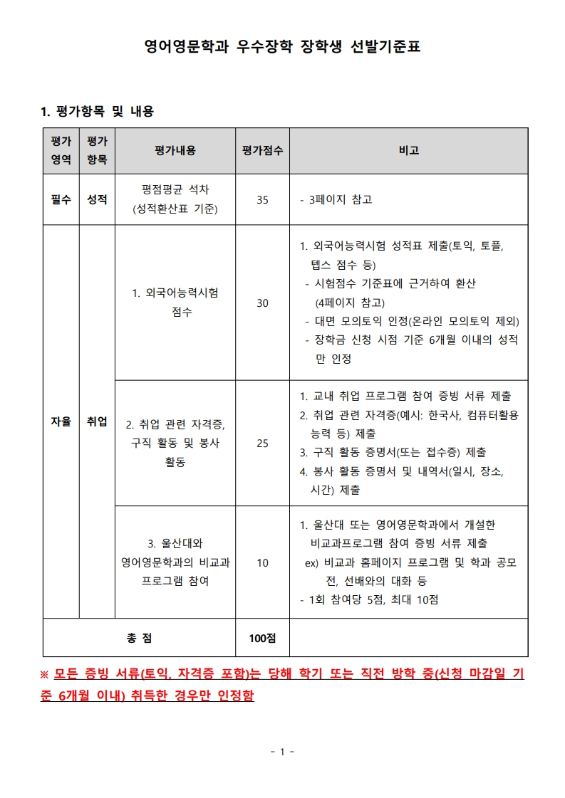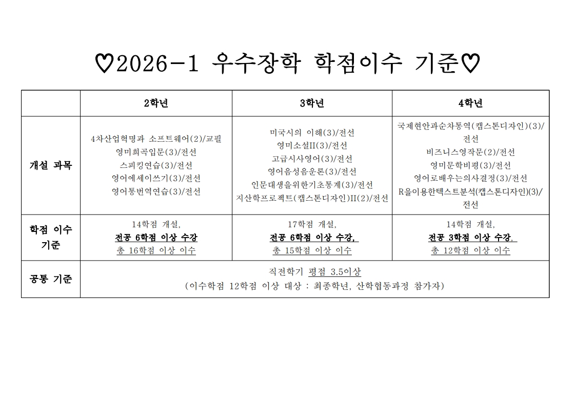 [필독]2026-1학기 우수장학 선발기준표 및 학점이수 기준 안내 | |||||