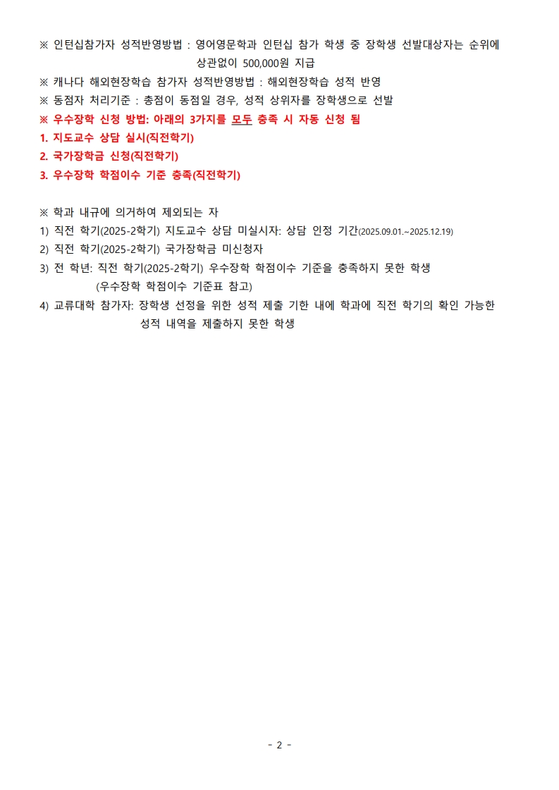 2. 신청 관련 ▶ 모든 학생은 우수장학에 자동으로 신청됨. 본인이 충족한 외국어능력시험 점수, 구직 및 봉사활동 점수, 비교과프로그램 참여도를 증빙할 수 있는 서류를 기간 내에 제출하면 됨.